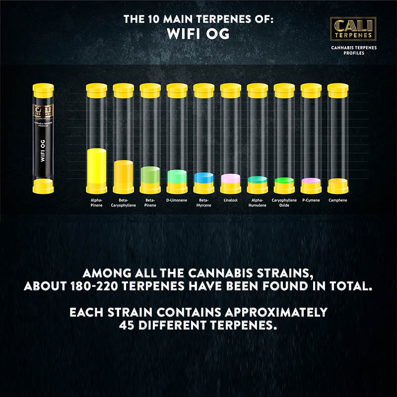 Mots-clefs : Terpènes, Cali Terpenes, Wifi OG, profil OG, terpènes CBD, terpènes HHC, terpènes CBG, terpènes CBN, vape, distillats, terpènes naturels, 1 ml