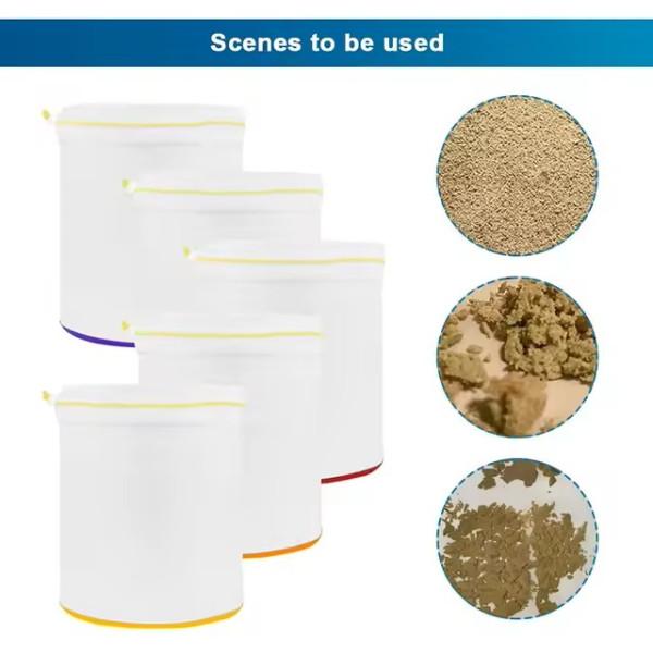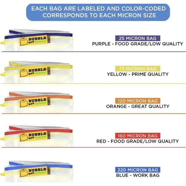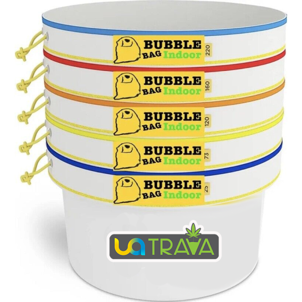 Мішки для льодяної екстракції Ice Bags. Комплект із 5 мішків по 18–19 літрів — одне робоче сито (220 мкм) для видалення домішок і чотири мішки з різними розмірами комірок. Усі мішки мають шнурки для зручної фіксації на ємності (відрі).