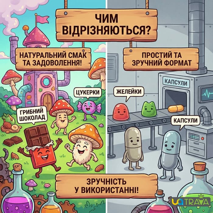 Грибний шоколад та цукерки мають іншу емоційну складову, ніж желейки або капсули. Якщо желейки часто сприймаються як функціональний перекус, то шоколад і цукерки асоціюються з задоволенням і відпочинком.