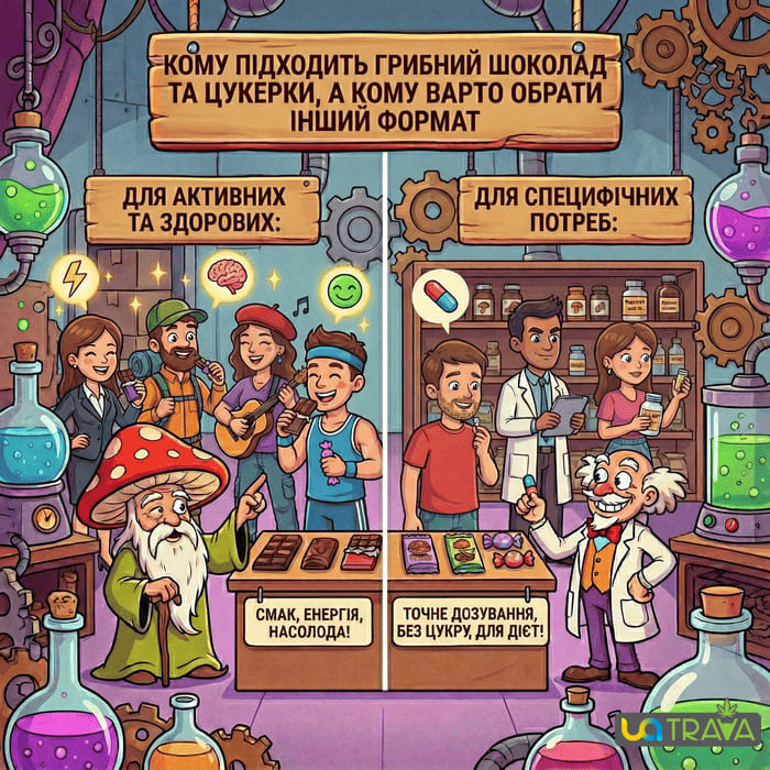 Водночас грибний шоколад і цукерки підходять не всім. Якщо людина уникає солодкого або принципово не вживає цукор і підсолоджувачі, цей формат може бути некомфортним. Також він не є оптимальним для тих, хто шукає максимально концентровані формули без додаткових компонентів. У таких випадках капсули або екстракти виглядають логічніше.